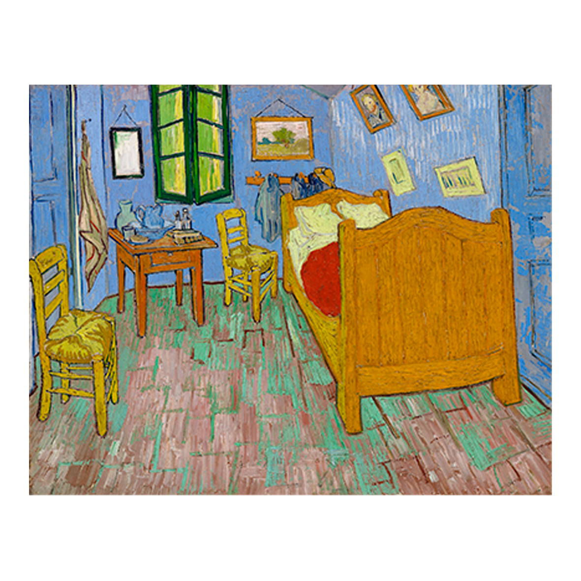 フィンセント・ファン・ゴッホの《寝室》(The Bedroom, 1889)は、ゴッホが自らの寝室を描いたもので、彼の個人的な空間を通じて孤独感や安らぎを表現しています。色彩は明るく、特に青と黄色が強調されており、彼の感情的な状態を反映しています。家具や壁の配置は、彼の内面的な世界を象徴しており、視覚的に彼の心情を伝えています。