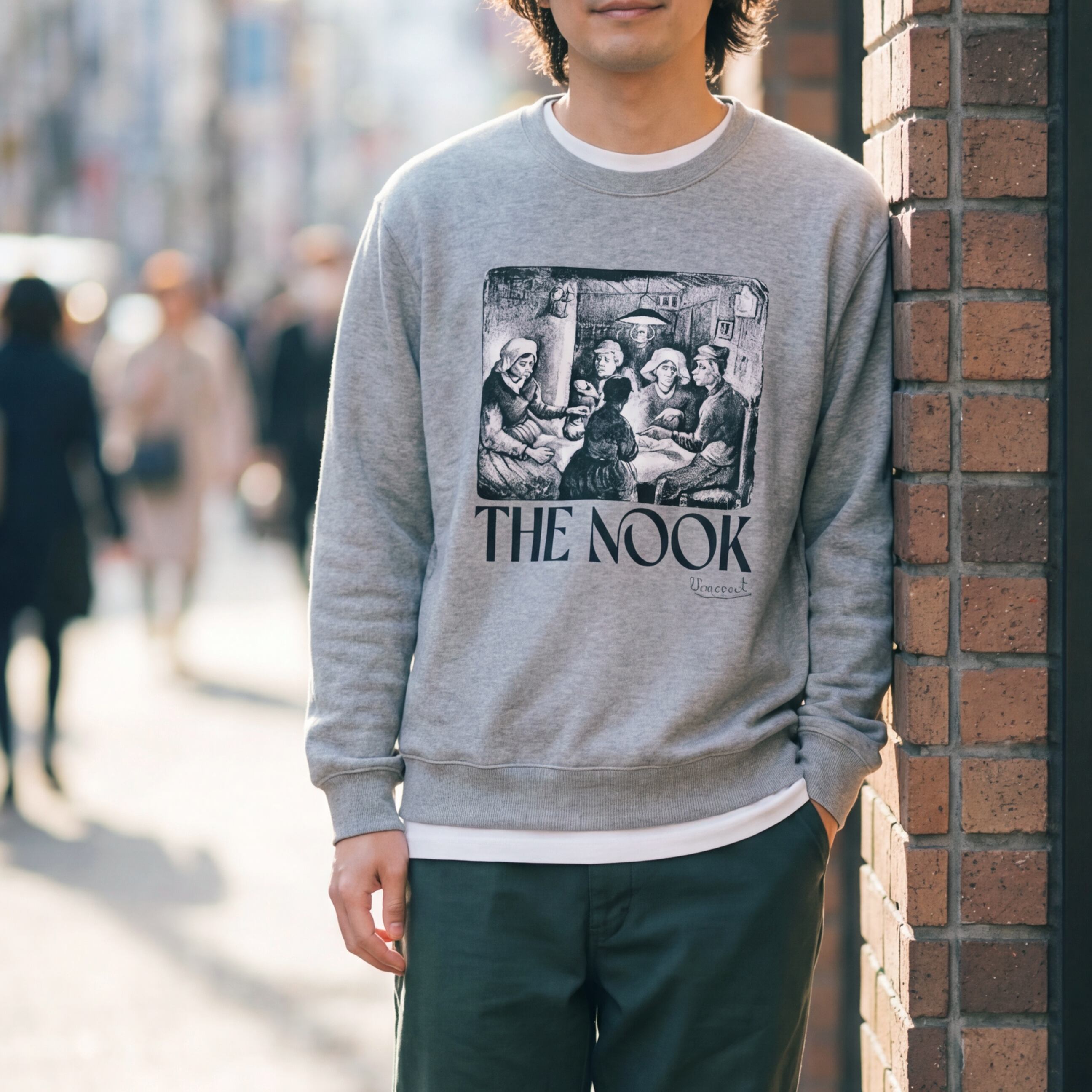 フィンセント・ファン・ゴッホ《ジャガイモを食べる人々》(Potato Eaters, 1885)の絵に、「こぢんまりとした空間」を表す「nook」という言葉を合わせ、狭い部屋で人々が家族や友人と寄り添いながら懸命に生きている姿を表現。